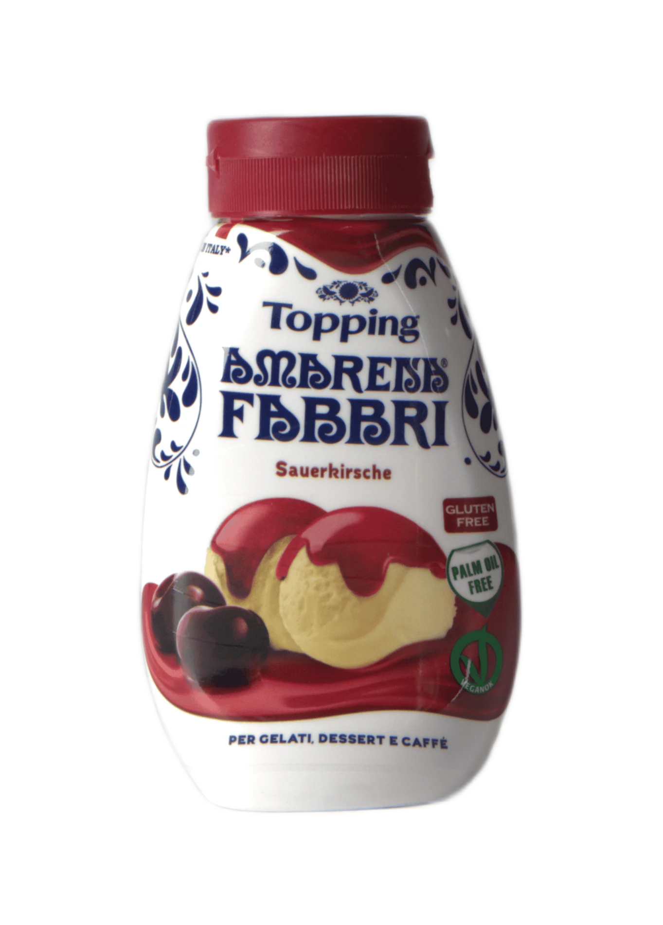 Der unverwechselbare Geschmack der Amarenakirsche in einem Mini-Topping des Traditions-Unternehmens Fabbri: Verfeinern Sie Kuchen, Eiscreme und andere kulinarische Köstlichkeiten mit der besonderen Note aus der Region Emilia-Romagna in Norditalien.