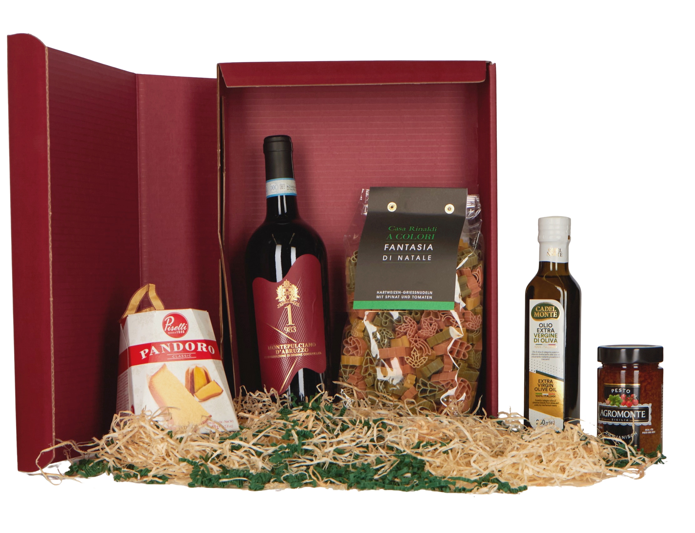 Weihnachtliches Geschenkset mit einer Flasche Rotwein, Weihnachtsnudeln und Pesto, Olivenöl und Pandoro
