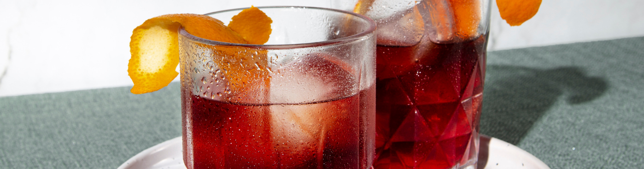 Den Drink dirket im Glas ansetzen: Dazu ein Tumbler mit Eiswürfeln füllen, roten Wermut und Campari hineingießen und gut verrühren. Wer den Aperitif etwas leichter und frischer mag, gibt nach Belieben einen Schuss Sodawasser dazu. Zum Abschluss den Americano mit einer Orangenscheibe oder -zeste aromatisieren.