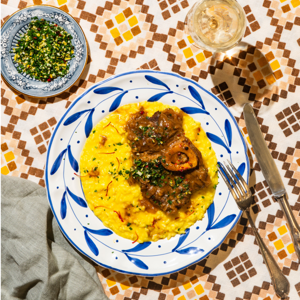 9. Das Risotto auf vier Teller verteilen, die Ossobuchi daneben anrichten. Mit Gremolata bestreuen und die Sauce aus dem Schmortopf darüberträufeln.